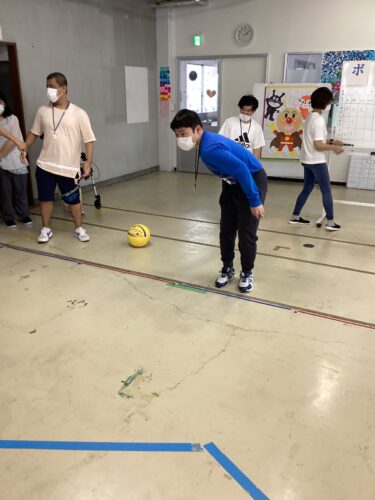 ボッチャで使用している球とペットボトルで製作したピンを使って室内で簡易的な「ボーリング大会」をみんなで楽しみました。ボーリングの点数次第でかき氷のトッピングが選べるといった企画であったため投球の1球1球に真剣さを感じ取れました。